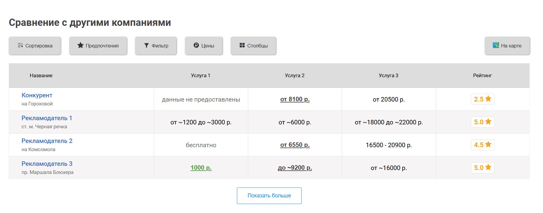 Если компания имеет конкурентные преимущества, мы можем их опубликовать на странице студии и показывать в таблицах в соответствующих страницах. Преимущества можно гибко настраивать для разных услуг. Правильная публикация преимуществ существенно увеличивает интерес клиентов, так как выделяет студию в таблицах и показывает, почему следует обратиться именно туда.