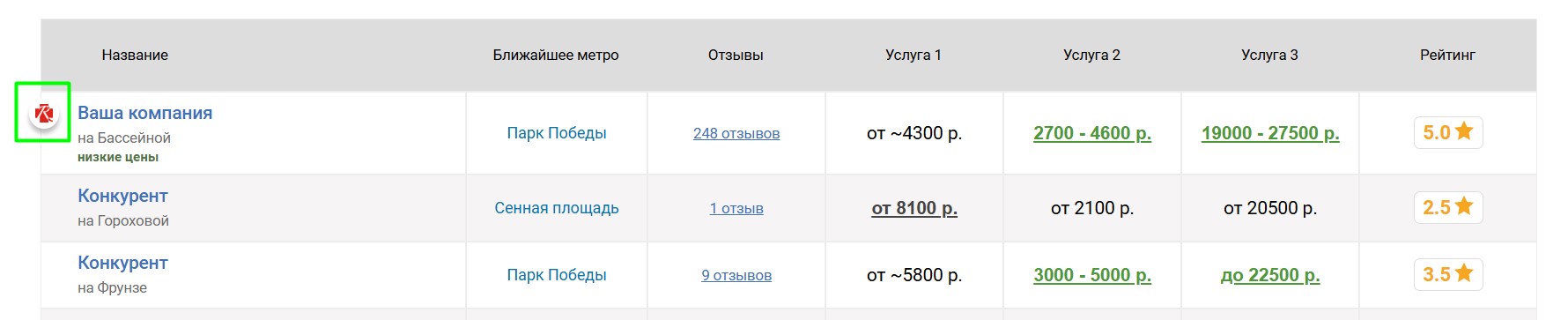 Иконка 16х16 пикселей будет отображаться слева от названия вашей студии в таблицах, выделяя её среди прочих. Опция увеличивает вероятность перехода на страницу компании и рекомендуется в качестве дополнения к прочим методам продвижения, в первую очередь для студий с узнаваемым брендом.